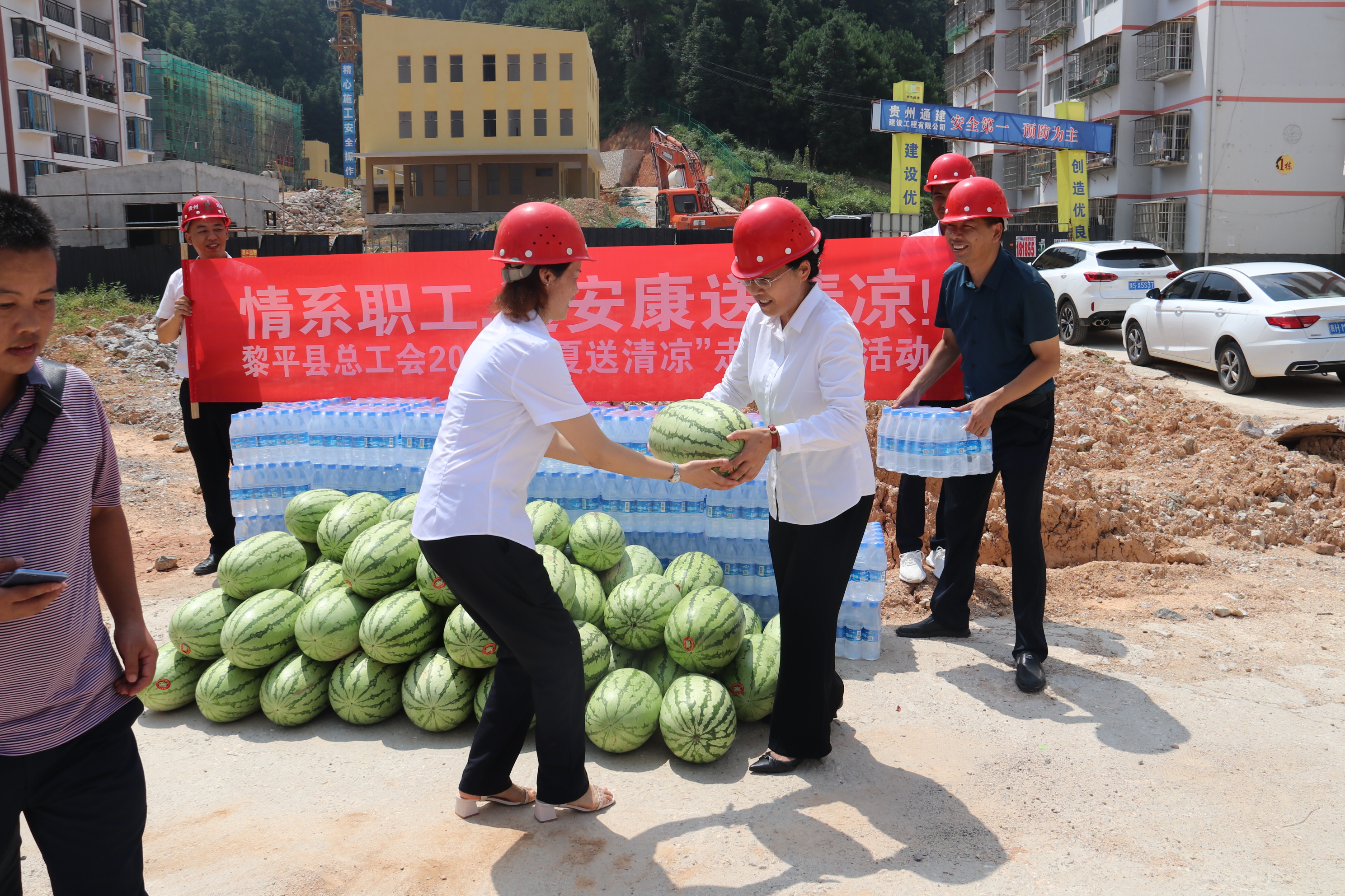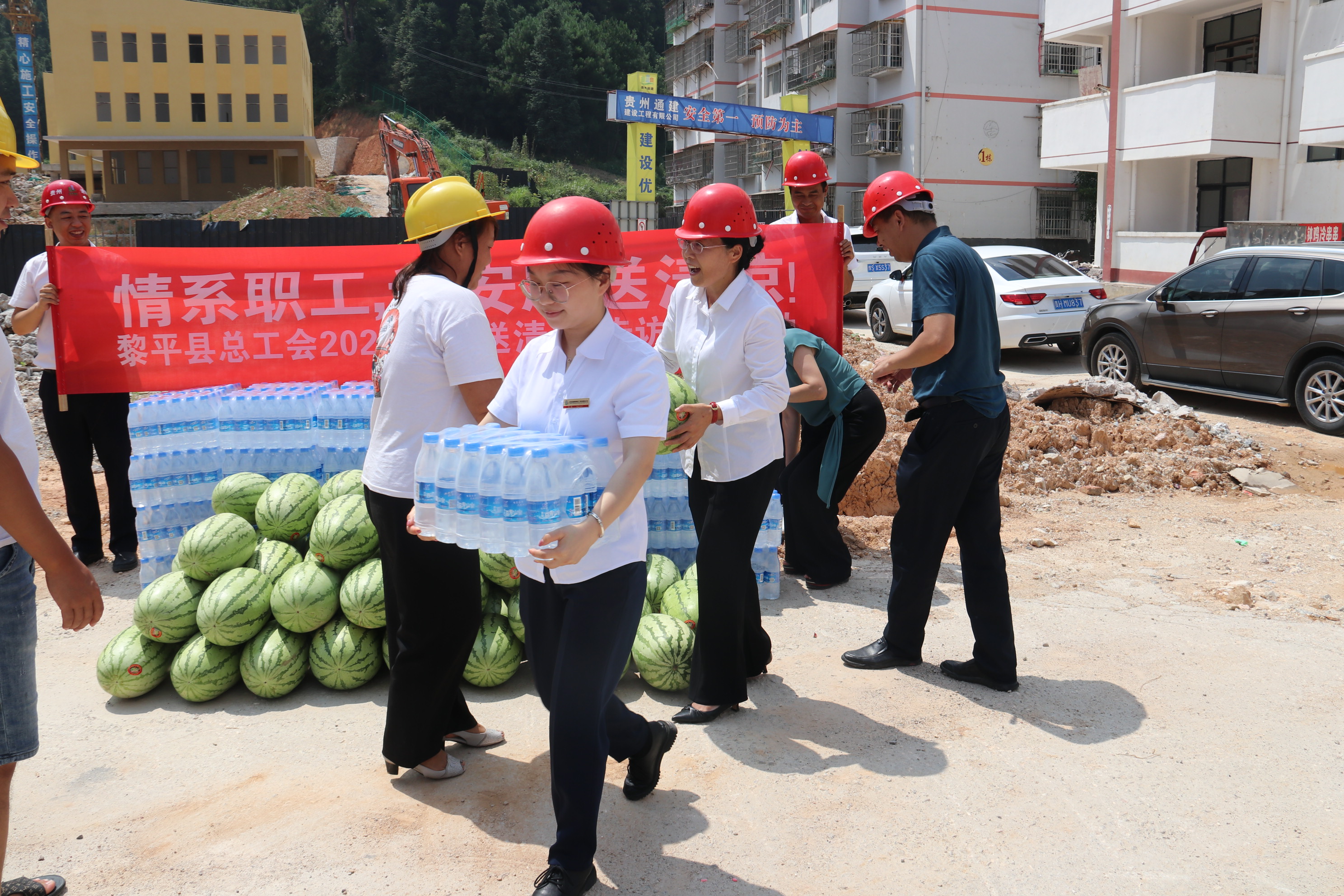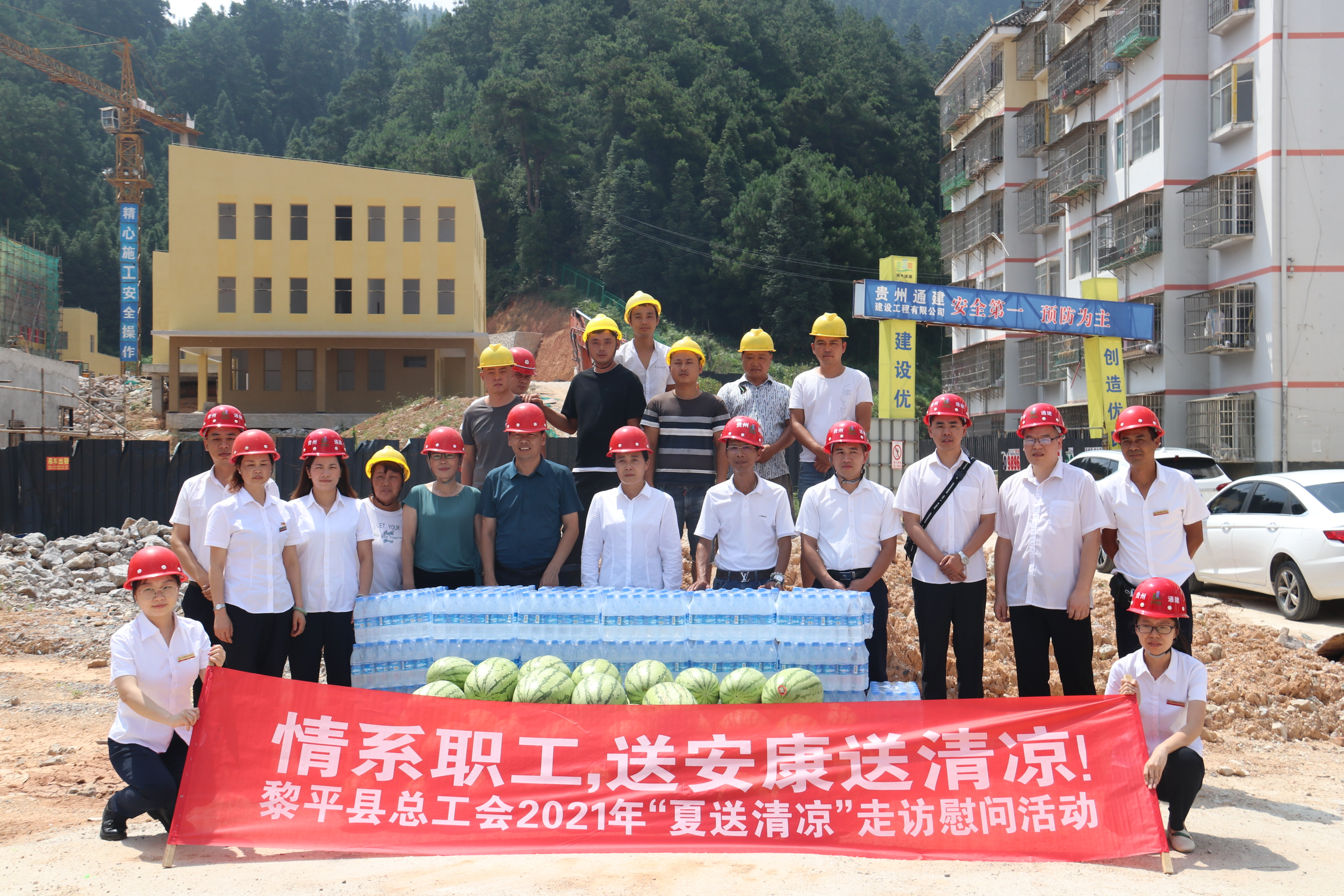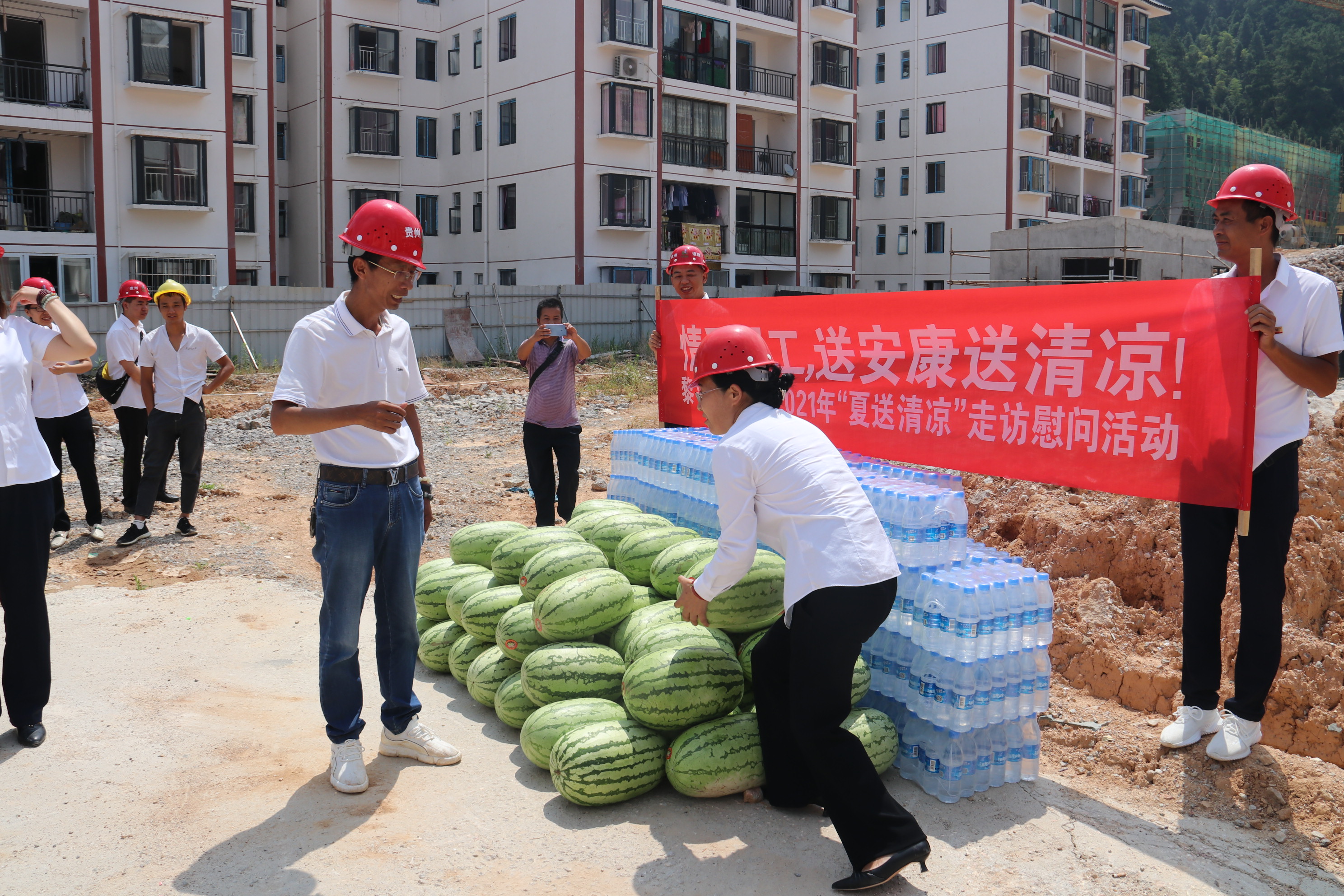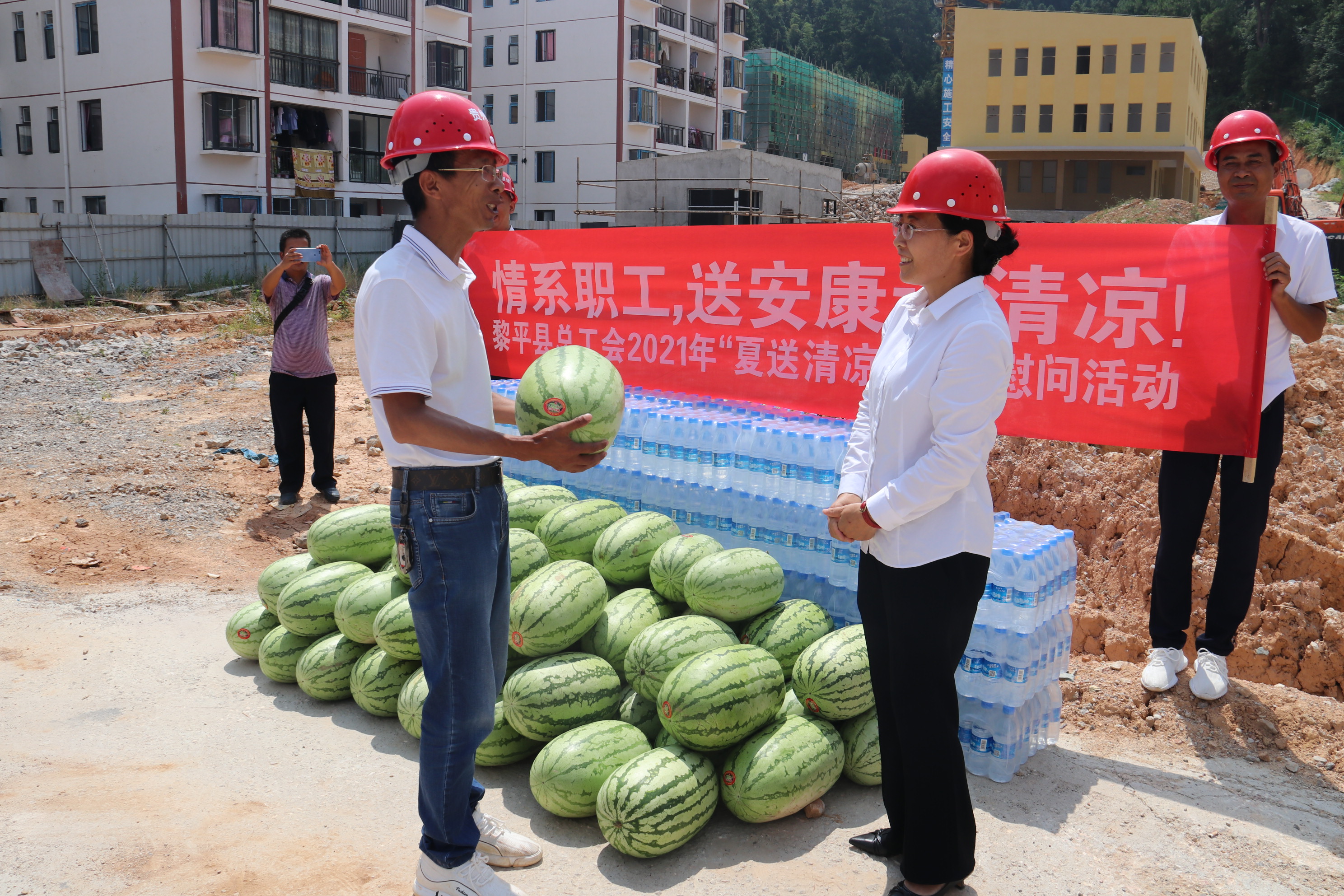 炎炎夏日,酷暑难耐。2021年7月21日上午,黎平县县总工会党组书记常务副主席龙懿、县总工会副主席王平森、县总工会副主席石晓烨等一行6人,深入MILAN米兰体育·(中国)官方网站“黎平县何家庄安置区2号幼儿园建设项目”项目部,亲切慰问冒着酷暑战斗在一线的公司职工、建筑工人,为在高温情况下仍坚持工作的一线工人送去清凉和关怀。本次慰问活动,县总工会共为该项目部工人送去西瓜500公斤、矿泉水50件。