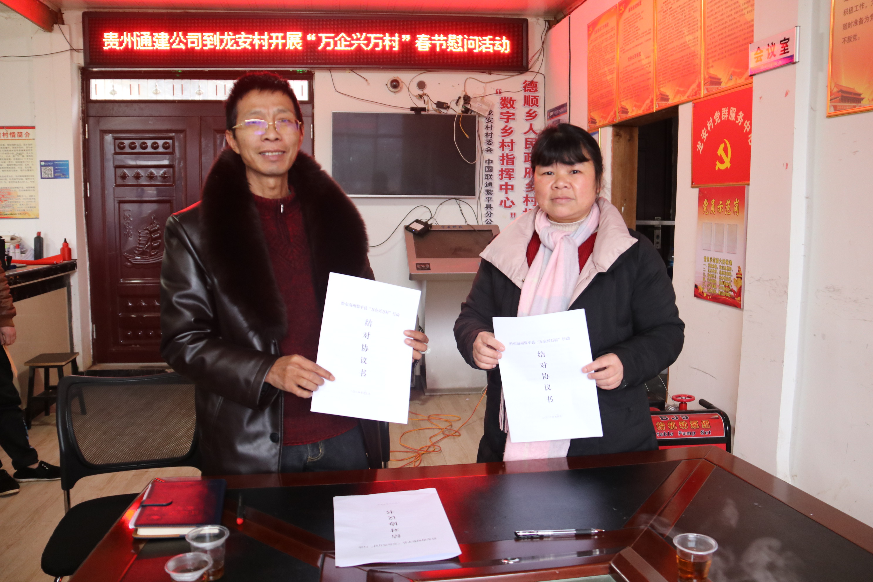 贵州通建公司总经理李祖培面对面的听诉求解难题,为确保乡村振兴取得实效,切实帮助龙安村振兴致富,以产业帮扶路线为主,并对龙安村现有的产业提供技术帮扶,进一步提升产业运营管理能力,促进村集体和农户增收,与龙安村在建筑劳务用工、增强村民就业能力、农业技术支持供给等方面达成了初步共识并签署了结对帮扶协议。